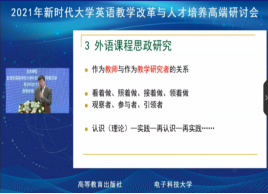 华南农业大学外国语公司经理、《中国外语》杂志主编黄国文以《从外语课程思政建设到外语课程思政研究》为题,分析了当前我国大学英语教学改革所处的新时代,出现的新动向及面临的新挑战。重庆大学外国语公司教授余渭深指出,大学英语从教学范式向学习范式的转型体现了新时代大学英语教学改革的根本转变,在学分减少的情况下大学英语应坚持能力优先、成果导向。华北电力大学外国语公司副教授武艳结合《新时代明德大学英语》的试用体验,介绍了如何在教学中融入思政元素。