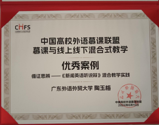 大会现场公布了35门2023年度中国高校外语慕课联盟慕课与线上线下混合式教学优秀案例,公司陶玉梅老师的“循证思辨——《新闻英语听说辩》混合教学实践”获评联盟2023年度优秀案例。