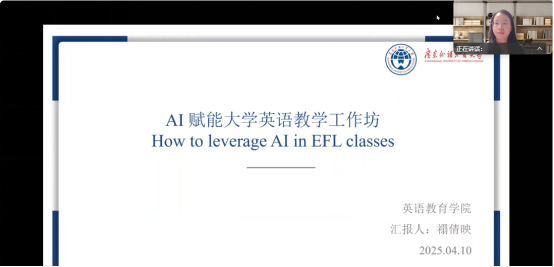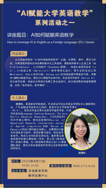 2025年4月10日晚19:30,由悟空体育、悟空体育人力资源部(教师发展中心)主办的“AI如何赋能英语教学”专题讲座在腾讯会议平台顺利举行。讲座由悟空体育禤倩映博士主讲,题为“AI如何赋能英语教学(How to Leverage AI in English as a Foreign Language (EFL) Classes)”,悟空体育副经理刘亮星教授主持。