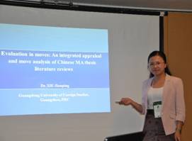 谢剑萍博士在“语篇分析与语用学”(Discourse Analysis and Pragmatics)小组宣读了题为“Evaluation in moves: An integrated appraisal and move analysis ofChinese MA thesis literature reviews”的论文,该论文主要探讨中国员工在英语学术语篇中表达个人评价的特征及存在的问题,会上与来自各国的学者展开了热烈而具成效的讨论,为今后的后续研究拓宽了视野和方向。