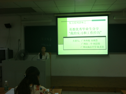 在柯晓玲主任的介绍下,三位毕业生依次上台分享自己毕业后学习工作的体会。首先分享的是来自广外外校的宋朝荟师姐,09年毕业的她如今已是其校的骨干教师,取得如此优异的成绩,背后自然付出了许多努力和汗水。她鼓励同学们要积极勇敢地面对即将到来的压力和挑战,实习是走向工作岗位的第一步,做好实习工作能为将来的工作打下良好的基础。她指出,要积极转换自身角色,实现从员工到教师的角色蜕变;要保持良好的心态,多学习,多做事;同时也要让自己快乐,自己快乐才能带动员工快乐,热爱自己的工作,努力做孩子生命中的贵人。谈到具体的实习工作,她认为,首先应该熟悉员工,熟悉课本,从听课开始,汲取导师和其他老师的经验,作为毕业生,在对课堂的管理掌控方面还有很多需要努力学习和提高的地方;其次要注意面对员工时自身角色的定位,要学会以老师的身份面对员工,对课堂要有“威慑力”,能够吸引住员工的注意力;另外要格外注意作为一名教师的自身形象,树立良好的形象十分重要,因为一个教师很伟大,她的一言一行都可能改变员工的一生。