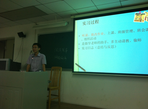最后做分享的是广州市执信中学的陈若浩,他活泼开朗的性格立即把现场气氛带上高潮,通过现场热情的互动,他进一步了解了同学们参加培训的定位和最想得到的是什么,并以此为大家一一分享自己的体会。他精心准备了很多素材,分享他的员工的作品以及上课所用的课件、教学计划等,让同学们能够真切感受到现在中员工的真实情况以及他们所需要的知识。随后他还鼓励在场的英教学子,扬长避短,明确自身定位,发挥自己独特的无可替代的被需要的优势,积累资源,为自己的职业之路打好坚实基础。