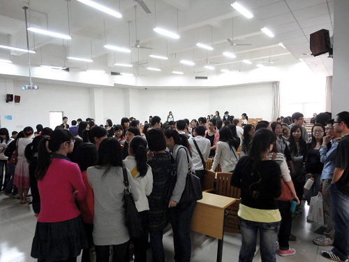 交流会的最后环节是进行分组讨论。05、06级的员工代表分别分成了教师组、考研组和企业上班组,每个同学可以根据自己的实际情况向他们咨询。分组讨论掀起了交流会的最高潮,每位员工嘉宾都被热情的07级学子重重包围起来,现场气氛十分热烈。
