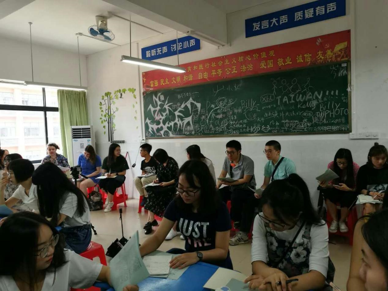 (二)置身公司第一印象是环境幽雅,公司周围的建筑不是很密集,因此也能够让员工们在一个相对安静整洁的环境学习。老师们采取全英的课堂上英语课,员工们上课用的是公司编辑的特色教材,坐在互动式的座位(综英课堂座位摆放),老师准备了课堂所需的练习的handout发给员工。