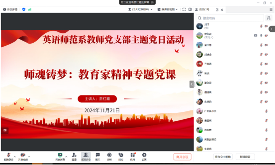 11月21日下午,悟空体育英语师范系教师党支部通过腾讯会议举办“师魂铸梦:教育家精神专题党课”主题党日活动。本次活动由支部书记贾红霞主持,师范系全体党员教师参加。