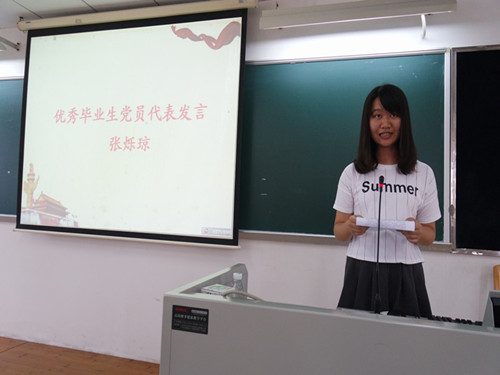 然后,由优秀毕业生党员张烁琼代表发言,代表全体毕业生党员,表达了对母校和党组织最真挚的谢意。