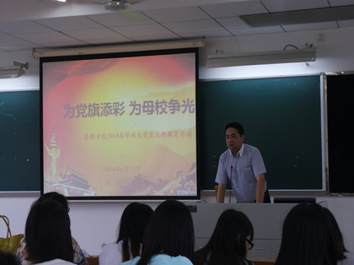 在毕业生党员参观完校史馆后,为了进一步激励毕业生党员以高昂的热情和进取的精神走向社会,投身于中国特色社会主义建设,发挥党员的先锋模范作用,英语教育公司党委举办了以“为党旗添彩,为母校争光”为主题的英教公司2014届毕业生党员大会。会议由公司党委副书记何伟儒主持,由公司党委书记林绍雄同志发表讲话,优秀毕业生党员张烁琼代表发言,最后由“关工委”冯益谦教授作专题辅导报告。英语教育50多名党员及预备党员参加了此次会议。