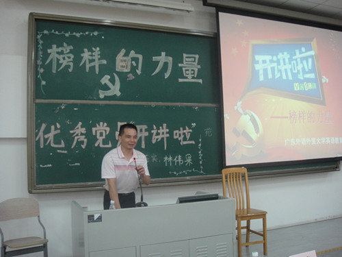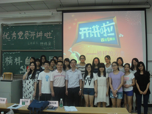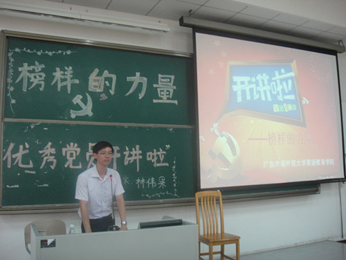 2014年9月12日10:00,英语教育公司党委在南校区教学楼C308举办了党建工作坊之榜样的力量——优秀党员“开讲啦”活动。开讲者为法公司2006届优秀员工林伟果,他与公司的部分同学分享了个人的成长历程、学习工作经历和体会以及人生发展感悟,通过现身说法使同学们受到启迪、得到教益。英语教育公司党委书记林绍雄、副书记何伟儒等领导以及教育系2011级、2012级的党员、入党积极分子和员工骨干等参加了活动。