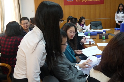 校团委老师认真听取员工汇报