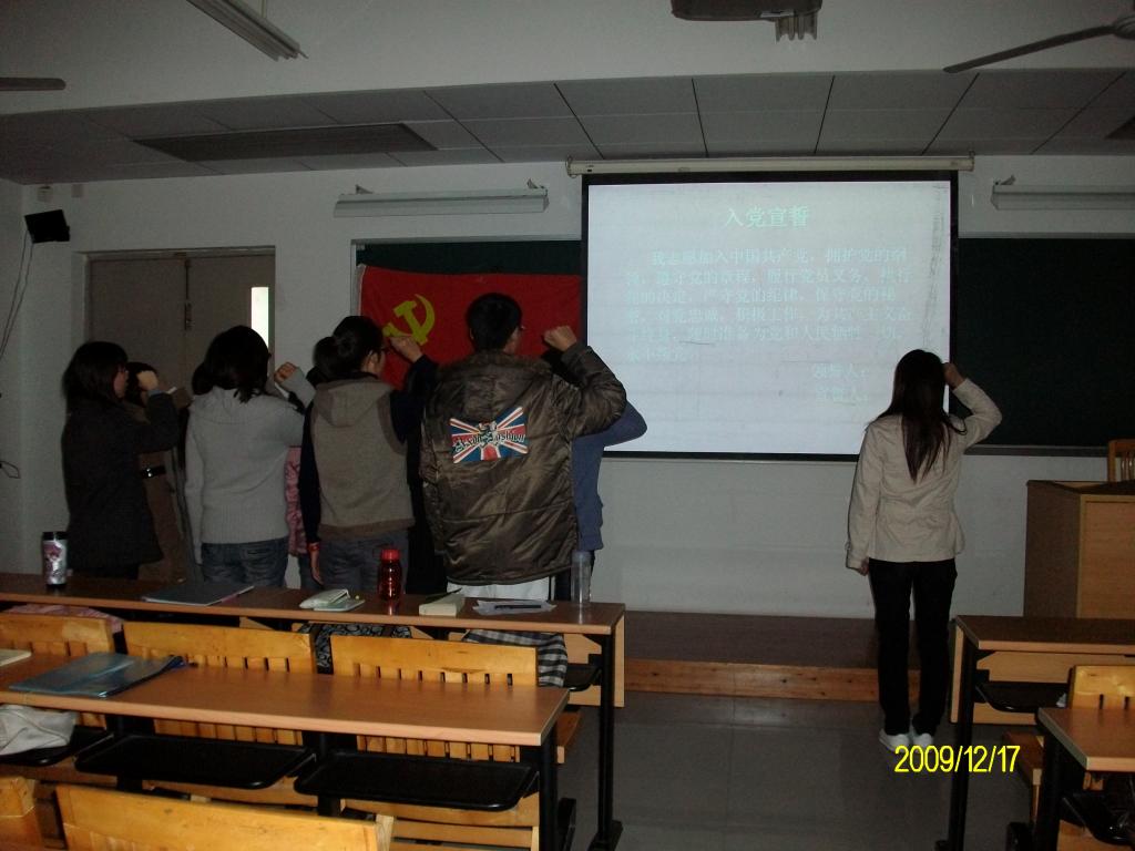 9名同志逐一认真地宣读了入党申请书,并做了专题为“如何做一名合格的员工党员”的报告。他们的入党联系人分别对他们给予了评价。之后支部有表决权的同志进行表决,经过表决,9名同志正式加入中国共产党,为07级员工党支部注入了新的血液。最后,支部书记刘嘉玲同志的带领下,9名同志在党旗下庄重宣誓:我志愿加入中国共产党,拥护党的纲领,遵守党的章程,履行党员义务,执行党的决定,严守党的纪律,保守党的秘密,对党忠诚,积极工作,为共产主义奋斗终身,随时准备为党和人民牺牲一切,永不叛党。