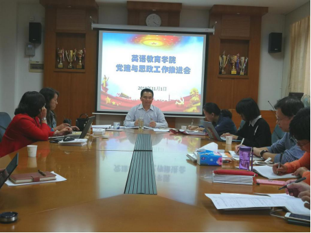 本网讯 11月1日,英语教育公司党建与思政工作推进会在南校区院系楼24会议室召开。英语教育公司党委委员、组织员、各党支部书记和员工党建小组骨干成员参加此次会议。会议由党委书记林绍雄主持。