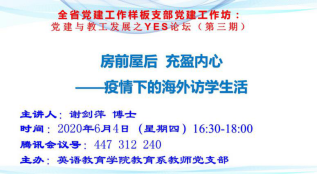当疫情蔓延到世界各国时,抗击新冠病毒疫情成了各国面对的共同问题。教育系教师党支部中有三位老师在海外工作和访学,疫情爆发以来,支部通过腾讯会议、微信等方式和他们沟通交流,他们对海外抗疫的分享和感受构建了战疫故事汇的特殊视角。周富强老师是佛得角孔子公司的中方经理,疫情之下,佛得角孔子公司第一时间成立了疫情防控领导小组,并积极加强与驻佛使馆、中资机构、援佛医疗队等联系,加强防疫知识技能学习。周富强老师带领19位孔院员工坚守佛得角,在员工无法复课的情况下,做好线上教学,虽然有困难,但是一直在努力坚持。他说,他为祖国的发展和进步感到自豪和骄傲,决心坚守在佛得角这块小小的阵地上,克服困难,为国家争光。杨韶刚老师是埃及艾因夏姆斯大学孔子课堂的中方经理,疫情期间,身处海外,他深深感受到中国对本国公民的关爱和帮助,在全球疫情爆发期间,中国驻埃及大使馆为在埃及的中国公民筹集提供包括口罩在内的防护用品,让在海外的中国公民可以第一时间做好个人防护。通过这次疫情期间发生的点点滴滴,他真切感受了到祖国的温暖和伟大,深深体会到中国政府在这次疫情中 “有责任、有担当”,始终把人民的生命安全放在第一位;感受到了祖国在医疗和科技等方面的先进水平,以及海外的中国人对祖国的无限信任。谢剑萍老师疫情期间在英国访学,她通过各种网络新闻媒体时刻关注着祖国的动态,英国的疫情虽然缓和,但是每天感染人数与国内相比,还是令人触目惊心。每当她看到这些数据,就更加感觉到祖国的强大和祖国人民的上下一心。她相信经历这次疫情后,每个中国人会更为祖国感到骄傲,会更加爱国。