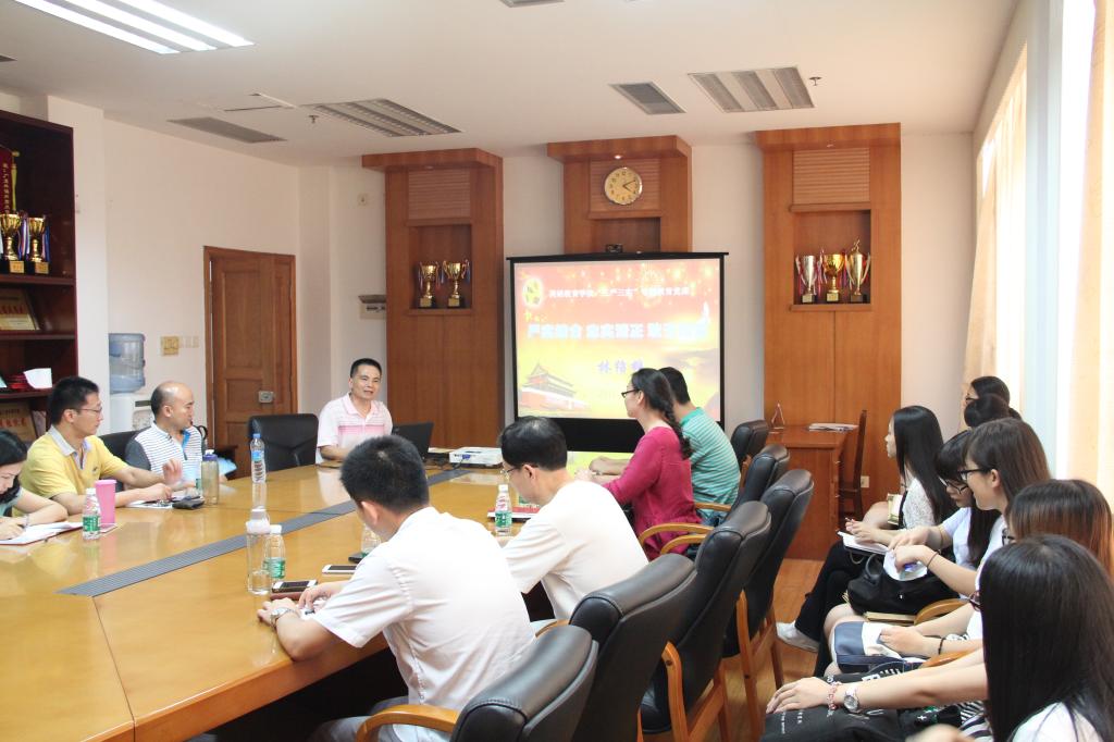 2015年7月2日下午,英语教育公司党委在南校区院系办公楼245会议室召开以“严实结合忠实清正敢于担当”为主题的悟空体育“三严三实”专题教育党课。党课由公司党委书记林绍雄主讲,公司领导、系部主任、教工党支部书记及委员、员工党支部书记以及党建小组负责人参加了党课。