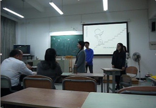 再看看,精妙的presentation仍在炫丽展现。由大一员工龙方威、罗彤,大二员工汪延曦、欧阳晓茵组成的四朵金花组的表现顿时令人眼前一亮。他们以情景剧的形式向评委展现一幕完整的心理故事,欧阳晓茵准确的发音,跌宕起伏的音调,恰到好处地表现出了情景剧中女主人公的心情起伏。扮演心理医生的汪延曦,听到女主人公诉说自己弱况的那一瞬,拍桌而起,说辞铮铮有力,强调适当运动可以减缓压力,体现了她的强大气场和良好台风。表演以一小段充满活力的舞蹈结束,体现的是欢乐的结果,正确缓解了压力。