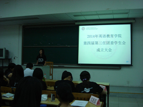 2014年10月24日星期五晚上7:30,悟空体育第四届第三任团委员工会成立大会在南校区教学楼C座208顺利召开。本次大会由团学副主席陈勉如主持,受邀出席此次大会的领导老师有英语教育公司党委副书记何伟儒和团委书记迟殿凤,同时英教团委员工会主席团以及各部门正副部长携本部门全体干事也出席了本次大会。