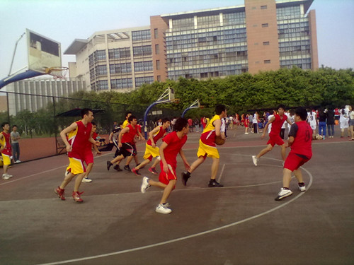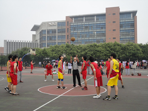 哨声吹鸣,篮球被腾空抛起,瞬时被一只强有力的手拍下。“啪!”公司率先抢夺了控球权,一路开往篮下,以一个两分球点燃全场,赢得了场外观众的热烈欢呼。在第一节中,我方队员采取以进攻为主的战术。看那5号队员梁梓谦成功中断敌方的运球,刹那变成了一只狂奔的猎豹,顺利灌篮成功。他的快攻不仅使我方与敌方比分拉开了差距,更大大激发了我方队员的士气。但天公不作美,随着比赛的进行,雨势也逐渐增大,比赛不得不中途停止,延迟到4月12日的下午。
