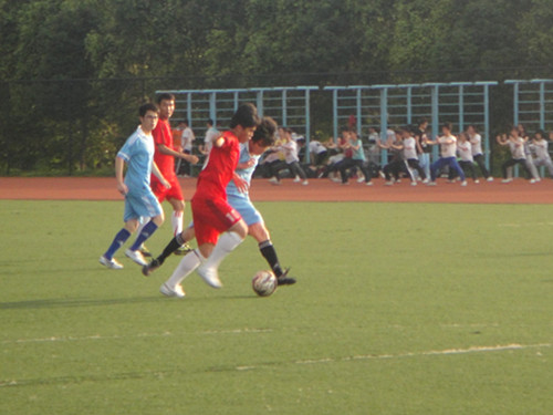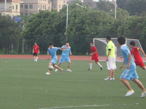 比赛于下午5点20分正式开始。一开场,经贸队首先发起进攻,队员连续传球,长驱直入破入我方禁区,我方的队员迅速防守,并试图抢球,但频频失败。对方攻势猛烈,捉住我方防守空隙,于球门左侧大力劲射,夺得一分。比赛继续进行,经贸一方始终保持着强有力的攻势,我方陷入被动防守。我方前锋13号球员吴福辉表现活跃,数次化解险情,缓解了后方的压力。上半场快结束时,经贸加大进攻力度,而我方防御不力,被对方连进4球,上半场以英教对经贸0:5结束。