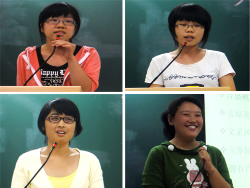 第二个环节,“找同类”。每个人都抽到了一张写有动物名字的纸片;然后,主持人要求大家只能通过模仿动物的声音和动作来寻找同类,顿时教室里响起了猫、狗等动物的叫声。干事们被分成了六组,每个组定好了各具特色的组名,分别是“战斗鸡”、“狗仔队”、“南瓜放羊队”、“猫王”、“活力十蛇(四射)”、“丑小鸭”,还定好了口号。