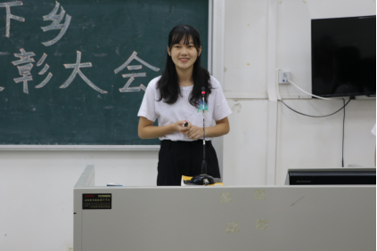 随后,主持人公布了今年三下乡表彰的结果。清远英德大湾服务队获得了本年度院级优秀队伍荣誉称号,卢浩然、王凤仪、郑岳雄、张泳仪、曾子莹、陈晓纯6位同学获得了院级优秀个人称号。其中来自大湾队的王凤仪同学和来自Tri-angel队的陈晓纯同学分别分享了自己的实践收获与感想。王凤仪谈到,这次三下乡她们乘兴而去,尽兴而归,体会到了“带着爱去换爱,用真心换真心”的内涵。她还提到,是孩子们的求知欲,让她们有了更多的动力一次一次地修改教案,完善课堂。陈晓纯同学则对夏令营坚强、独立又纯粹的孩子们表示感谢。她认为是这些孩子给了她温暖和力量,让她收获颇丰、成长良多。