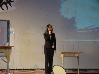 讲课过程中的来自英教的伍诗婷(左)和正在自我介绍的来自华师的柯盈莹