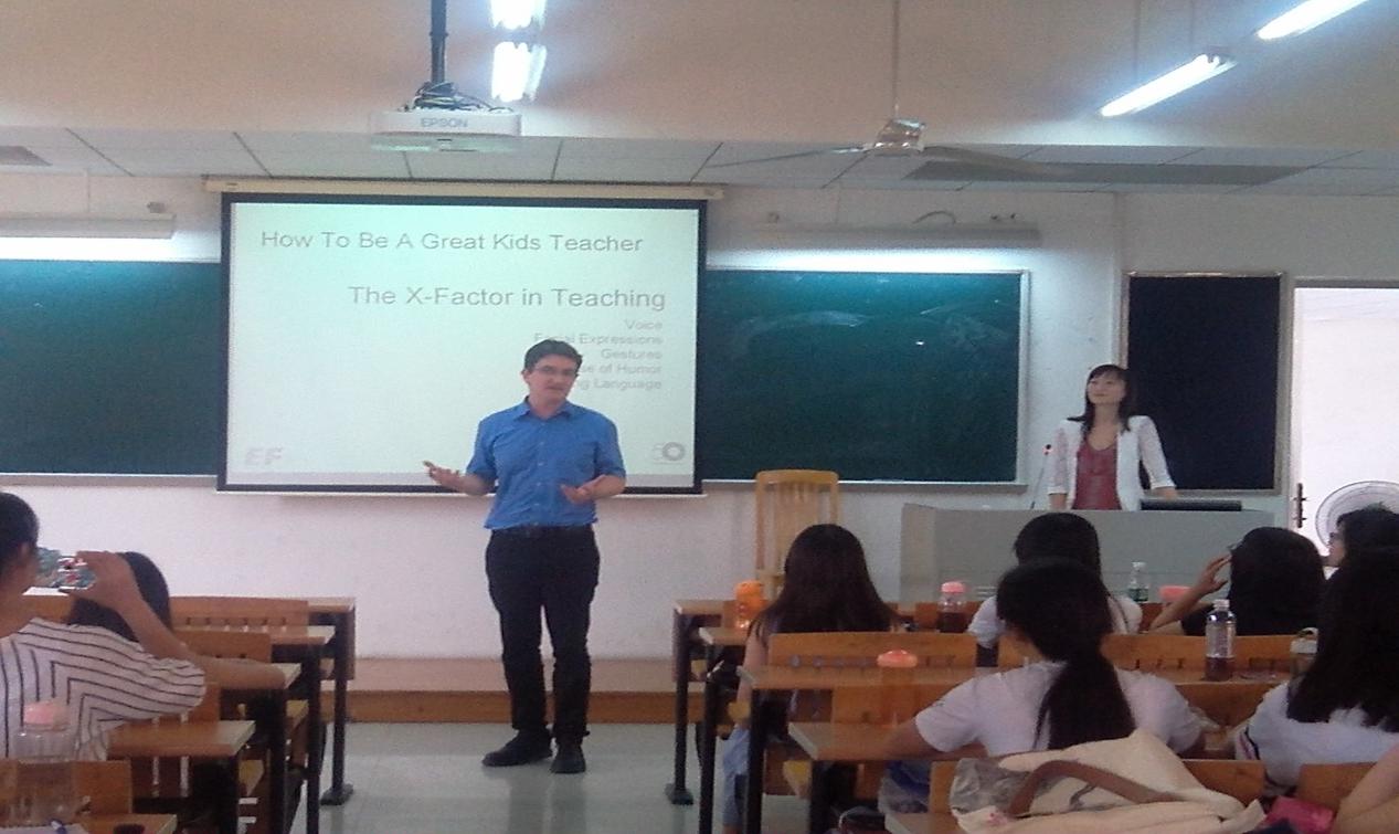 910日上午南校区教学楼F309,英孚教育戚娇莹、Steven Hogan以及余颖昕为公司2012级教育系员工作了实习教育讲座。该讲座由教育系主任谢剑萍主持,副经理熊涛出席了此次讲座。