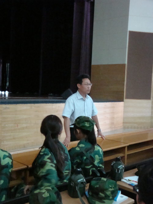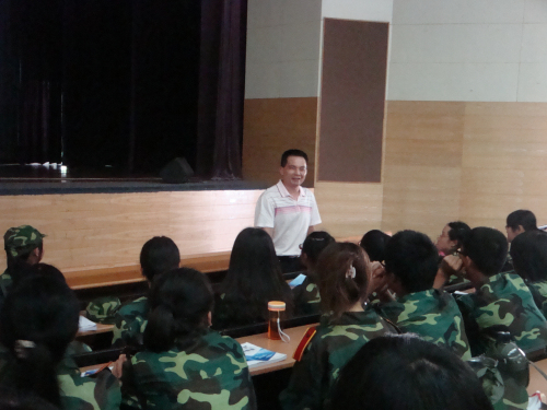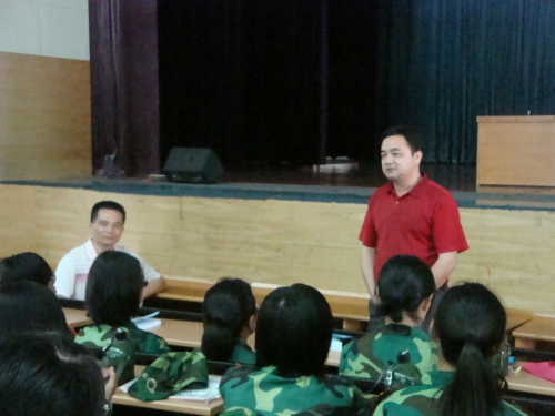董金伟经理首先代表公司预祝新生们中秋快乐,说在军训中与来自五湖四海的新同学们一起过中秋使佳节更显特别,公司也在这特别的节日里为大家送来饭票与清凉饮料,“让大家加加餐”,让大家感受到英教大家庭的温暖。随后董经理更详尽地跟新生谈起了英教专业的优势,英教专业的针对性强,而“英语强,教育好”的特色更使课程设置上与港澳接轨,英教学子也有更多境外交流的机会。