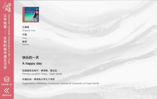 2021年1月,教育部中外语言交流合作中心(语合中心)文化处发起了“汉字风景:在我的城市里遇见汉字”短视频项目,历经三个月的脚本创作、线上培训和视频拍摄,佛得角孔子公司公派教师孔晴晴作品《快乐的一天》成功入选。