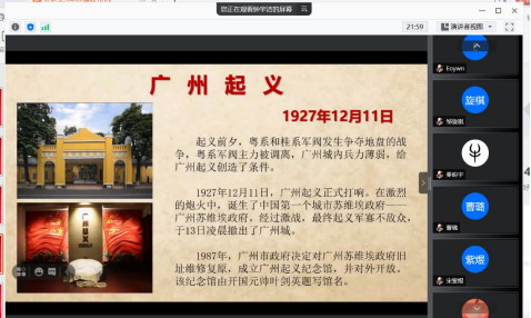 钟宇洁同志以广州起义为话题,为班级同学详细讲述了广州起义的具体内涵和来龙去脉。她说,尽管此次起义失败了,起义军英勇无比的战斗精神给了中国人民新的鼓舞,促使人们坚持不懈地为中国革命事业顽强奋斗。