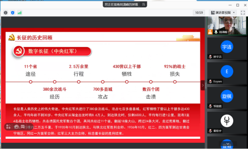 周潇峰同志分享自己给本班同学讲述长征路上重要历史事件。她用几个关键数字回顾了红军长征的行程、战斗次数、攻占的县城、牺牲和损失,给同学们留下了清晰的印象。