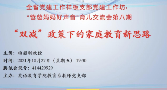 为了践行党建工作服务群众的宗旨,教育系教师党支部于2021年10月27日线上举办党建工作坊:第“爸爸妈妈好声音”家庭教育分享会。本次党建活动由教育系教师党支部书记张丽冰主持,邀请杨韶刚教授就 “双减”政策下的家庭教育进行分享。