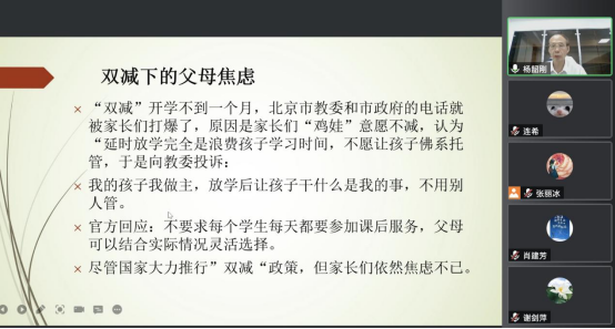 杨韶刚深入分析《关于进一步减轻义务教育阶段员工作业负担和校外培训负担的意见》(简称“双减”政策)的提出背景和意义,从国家层面解读了“双减”政策是国家为了降低家庭教育成本,提高民众生活幸福质量的需要。结合相关数据,指出近年来中国家庭越来越重视教育,家庭教育支出高,教育“焦虑”和“内卷”非常严重。针对焦虑,杨韶刚认为教育焦虑可以从四个方面溯源,即知识确定性的传统观念,全面发展与个性化发展的矛盾冲突,学习的近期目标与发展的远期目标的矛盾冲突,知识转换的不确定性引发的知行矛盾。他鼓励父母应该从“民间教育家”迈向“专家型教育家”。杨教授就舒缓教育焦虑提出自己的思考:应积极探索“结果评价、过程评价、增值评价、综合评价”等具体评价标准和评价方式,通过多元评价帮助孩子感受自己的点滴进步,也让家长平静原本焦虑的心态,找到平衡点,不让自己的焦虑影响孩子,以宽容的心态支持孩子的发展。