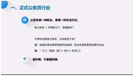 优秀员工陈倩倩以“新时代的赶考人”为题,分别从公务员职业、考公之路以及公务员考试的建议三个方面向全体同学分享了公务员考试的相关经验。她建议同学们要确定目标,尽早投入注意不能把战线拉的过长,同时应当结对复习,共享信息,找到志同道合的朋友一起学习、分享资料。