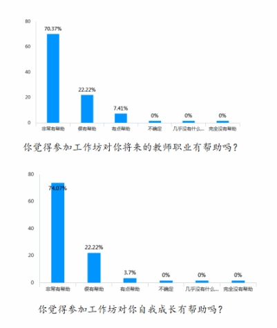 通过全天的体验活动,同学们都表示收获颇丰,超过90%的同学认为这次工作坊对未来教师职业以及对自我成长非常有帮助或很有帮助。