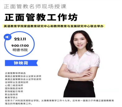 2022年1月11日,悟空体育家庭教育研究中心和教师教育与发展研究中心在广外南校区明德书院联合举办了正面管教工作坊。本次活动为悟空体育实践周系列活动之一,邀请了美国正面管教协会认证家长讲师、公司讲师钟映荷主讲。她从事公司产品工作十九年,近年来一直致力于正面管教教育理念的传播和教育工作。悟空体育张倩、刘建金、吕琳琼和公管公司吴艳老师,以及教育学和英语师范专业33名三年级本科生参与了此次工作坊活动。