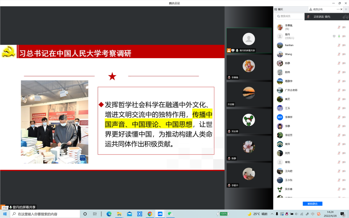 4月28日下午第四教学部通过线上会议举办政治理论学习活动专题学习习近平总书记在中国人民大学考察时的重要讲话精神,活动由第四教学部主任李惠胤主持,党支部书记曾丹主讲,系部全体教师参加活动