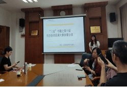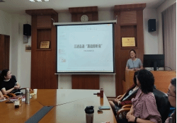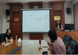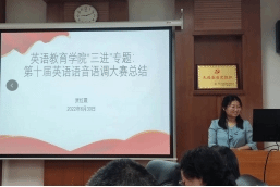 贾红霞老师对“三进”语音语调大赛的活动内容、开展过程、获奖情况等方面进行了总结和反思。齐湘燕老师展示了“三进”走进英语视听说的具体操作方式,通过词汇启发员工自主完成“三进”课堂展示,师生在互动中相互提高。陈艾舒老师讲述了英语演讲辩论课融入“三进”内容的方式。蔡竞老师总结了“三进”演讲比赛与书法活动的感悟。员工代表温尔文分析了“三进”与语音语调大赛的关联,并从朗诵、播报、演讲三个方面探讨了选手选题和“三进”内容的结合方式。员工代表易骏菲从个人和国家的角度,分享了参加“三进”语音语调大赛的感想。另两位员工代表翁子童和刘柳宏分别分享了个人参赛的体会和心得。