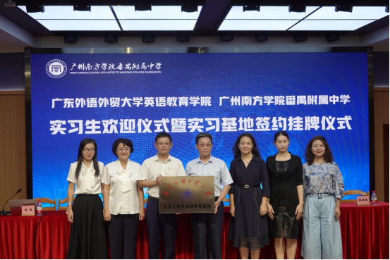 9月5日下午,公司与广州南方公司番禺附属中学(以下简称“番附”)共建“老员工校外实践教育基地”签约授牌仪式在番附举行。公司经理董金伟、副经理吴岩、教育系主任陈媛媛、办公室主任陈英、组织员刘臻嵘老师和首批实习员工,以及番附常务副董事长古敏锋、副董事长郁婷婷、董事长助理管春霞、各部门主任及部分老师出席了活动。