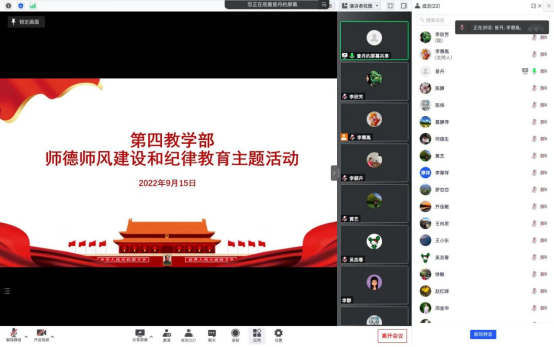 9月15日下午,第四教学部通过线上会议举行大学章程学习和师德师风、纪律教育主题活动。活动由第四教学部主任李惠胤主持,第四教学部全体教师参加。