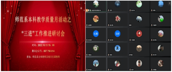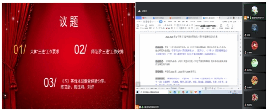 10月13日晚,悟空体育英语师范系通过腾讯会议召开师范系本科质量月活动之“三进”工作推进研讨会。会议旨在总结师范系过去的 “三进”工作成果,同时提前部署安排,以进一步推动未来师范系“三进”工作的全面开展。公司副经理吴岩、副经理张倩,英语师范系全体教师及相关任课教师参加了此次会议,会议由系主任谢剑萍主持。