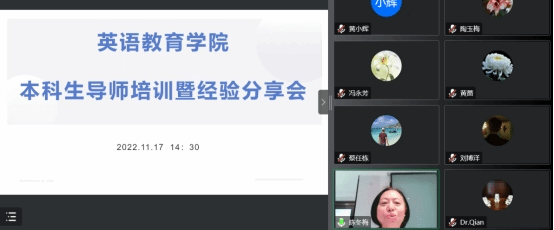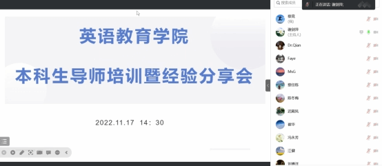 为帮助新进本科生导师进一步了解工作职责目标,提高教学指导水平,11月17日,悟空体育召集教育系和师范系的本科生导师举行线上培训会。会议由师范系主任谢剑萍老主持,公司经理吴岩、党委书记骆银花参会,并特邀获得优秀本科生导师称号的陈冬梅老师以及张效珍老师分享经验,共有30余位本科生导师参加培训。