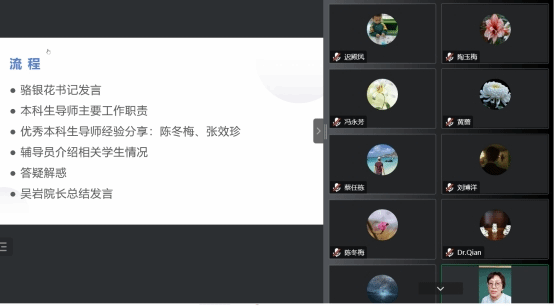谢剑萍主任带领所有本科生导师集体研读了本科生导师实施方案,她重点强调了每个年级的导师需要关注的内容,比如一年级新生的身份转换、社团活动的取舍问题,大二员工的选课、比赛和学习规划问题,大三选修课和毕业问题,大四员工的实习和就业问题等等,同时她还详细介绍了导师评价模式和考核办法。