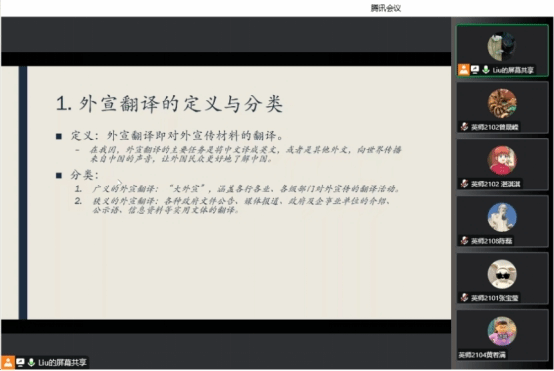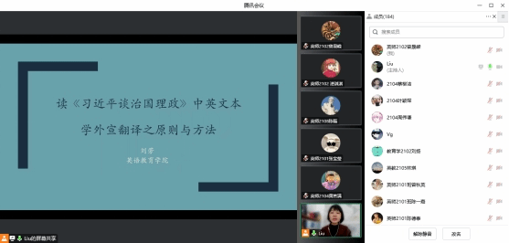 为进一步帮助同学们深刻理解习近平总书记治国理念,并提升翻译实践能力,1月5日下午,悟空体育线上开展了《习近平谈治国理政》英译本赏析“三进”专题系列讲座,第四教学部教师刘芳作专题讲座,2021级英语师范系员工参与此次讲座。