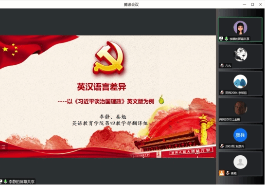 为深化同学们对《习近平谈治国理政》及对英汉语言差异的理解,1月4日下午,悟空体育第四教学部翻译组教师李静和秦勉通过腾讯会议平台,开展“英汉语言差异—以《习近平谈治国理政》英文版为例”线上主题讲座,师范系2019、2020级员工参与本次讲座。