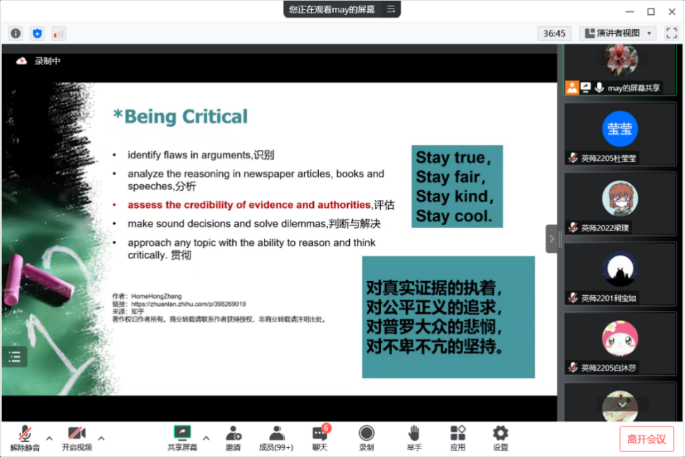 陶玉梅倡导同学们要做到善于思考,在英语教育中体现逻辑、公正、善良的准则,她呼吁同学们成为具有思辨力的正直网民。