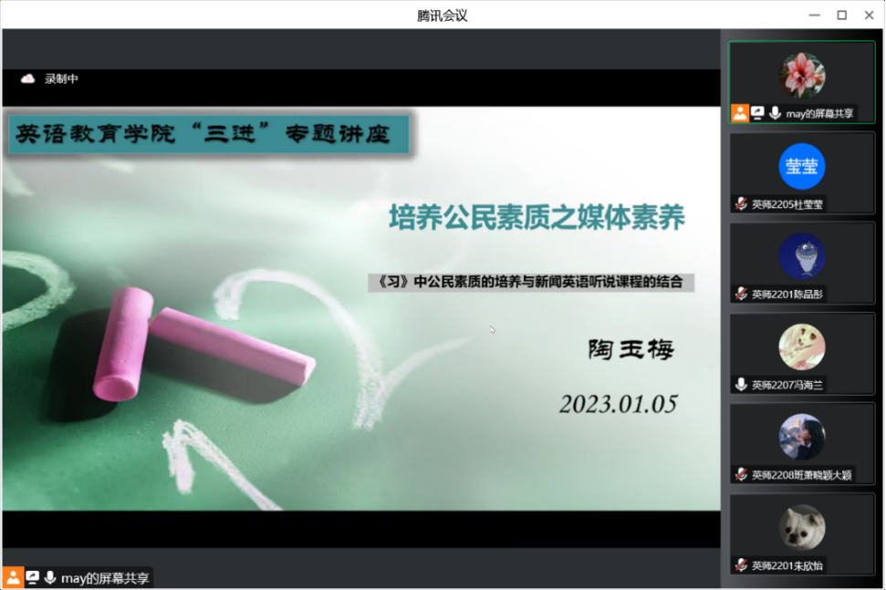 为进一步深化同学们对《习近平谈治国理政》的理解,提高同学们的公民素养,1月5日下午,悟空体育于线上开展读《习近平谈治国理政》精选听说“三进”专题讲座,讲座由第三教学部陶玉梅老师主讲,2022级全体同学参与本次讲座。