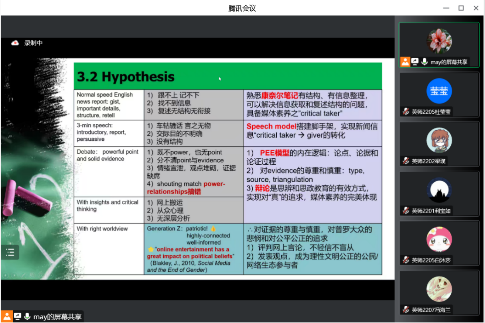 陶玉梅以几则英语新闻为例,剖析其内部结构,带领同学们批判地解读媒体新闻,培养员工思辨和产制资讯的能力。她从新闻的真实性、准确性、时效性三点切入,分析了当代新闻媒体存在结构缺失、证据缺席、无深层分析等问题,并提出康奈尔笔记法、思辨逻辑和思政教育三个课程支柱方法提高员工分析新闻的能力。