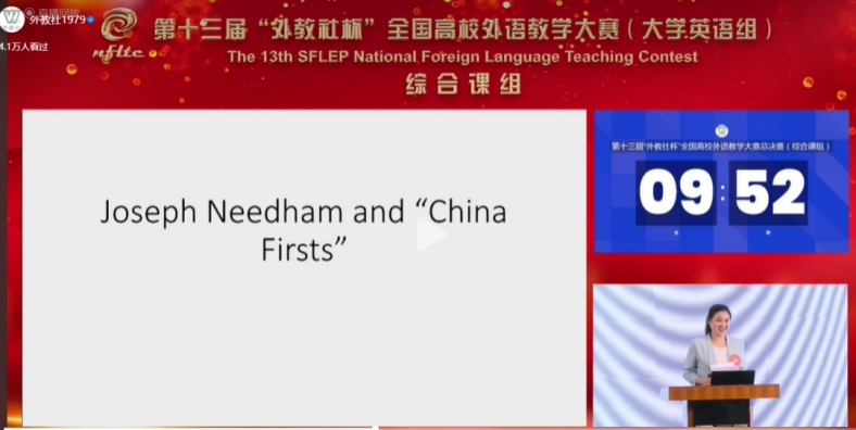 在说课环节中,范栩颖在有限时间里对“Joseph Needham and 'China Firsts'”一文进行深入全面分析,有效地体现了教学思路的高阶性、授课步骤的科学性与教学方法的创新性。