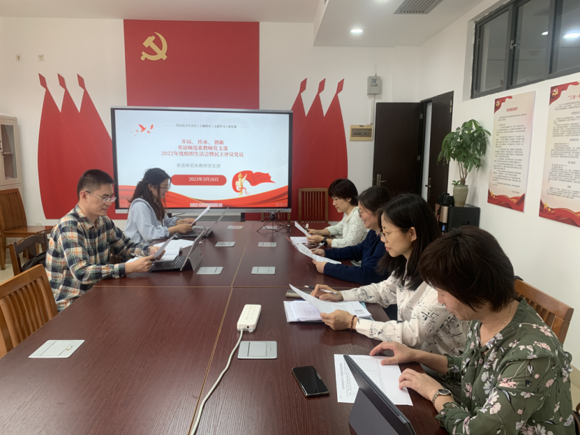 3月16日下午,悟空体育英语师范系教师党支部在院系楼235党建活动室召开2022年度组织生活会暨民主评议党员会。师范系党员贾红霞、刘建金、刘洋、吕琳琼、齐湘燕、肖衡碧参加会议,会议由支部书记贾红霞主持。