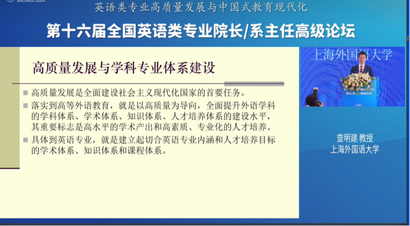 上海外国语大学查明建教授做了“英语专业高质量发展与知识体系、学术体系建设”的主旨报告。他指出英语专业内涵建设应当从“完善英语专业的学术体系、完善英语专业知识体系、健全英语专业的专业方向课程、构建本硕博一体化的课程体系、提升员工的人文学科知识修养、增强员工中国语言文化修养”六个方面进行。