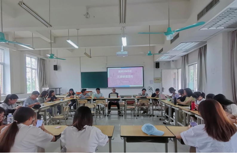 为贯彻“三进”活动指导思想,2023年5月上旬,悟空体育英语师范专业本科生各年级以班级为单位组织同学开展《习近平谈治国理政》英译本“三进”主题研读班会。各班级在导师和班委的带领下,选择《习近平谈治国理政》英译本某卷进行研读,形式多样新颖。通过轮流诵读,共同学习、自由讨论与研学、感想发言、归纳总结等环节,同学们受益匪浅,各班取得了良好的学习效果。